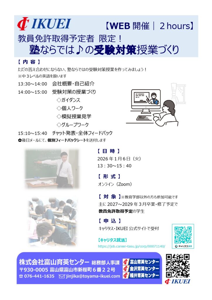 【1/6 WEB開催】教員免許取得者限定!塾ならでは♪の受験対策授業づくり