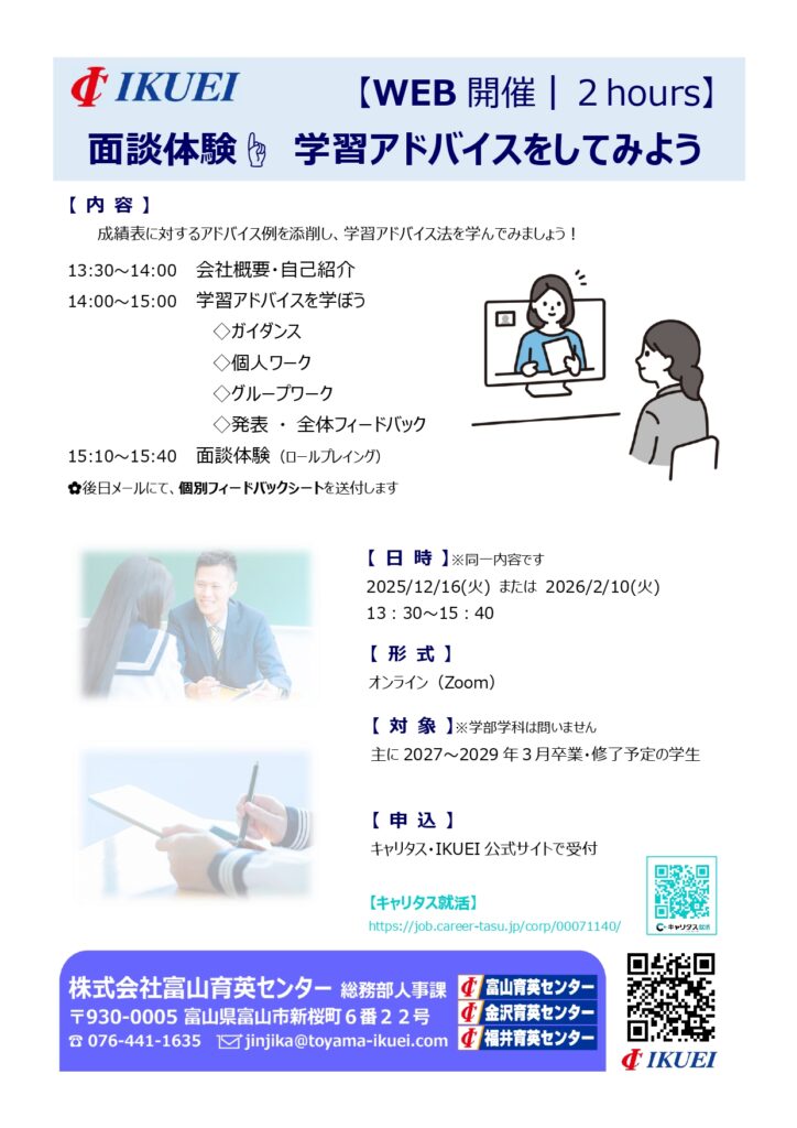 将来に活きる「聴く力」「伝える力」を磨きませんか。オンラインでの面談体験を通じて、教育の仕事のやりがいを実感できます。参加者への個別フィードバックも好評です。短時間で充実の学びをぜひ体験してください。