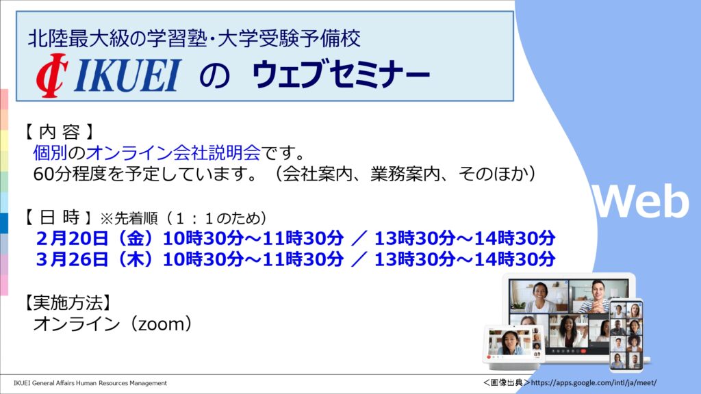 内容 個別のオンライン会社説明会です。 60分程度を予定しています。(会社案内、業務案内、そのほか) 2026卒/2027卒/既卒の方対象です。 あなたの一歩を、生徒も社員もお待ちしています! 日時 2月20日(金)10時30分~11時30分 または 13時30分~14時30分3月26日(木)10時30分~11時30分 または 13時30分~14時30分※先着順(1:1のため) 実施方法 オンライン(zoom)※お申込みいただいた方に当日URLを送付いたします お申込み(新卒の方) お申込み(キャリアの方) Post Share Hatena LINE 【2/26 富山】IKUEIまるごと会社説明会 前の記事 【2/14 WEB】いしかわ企業研究EXPO 次の記事