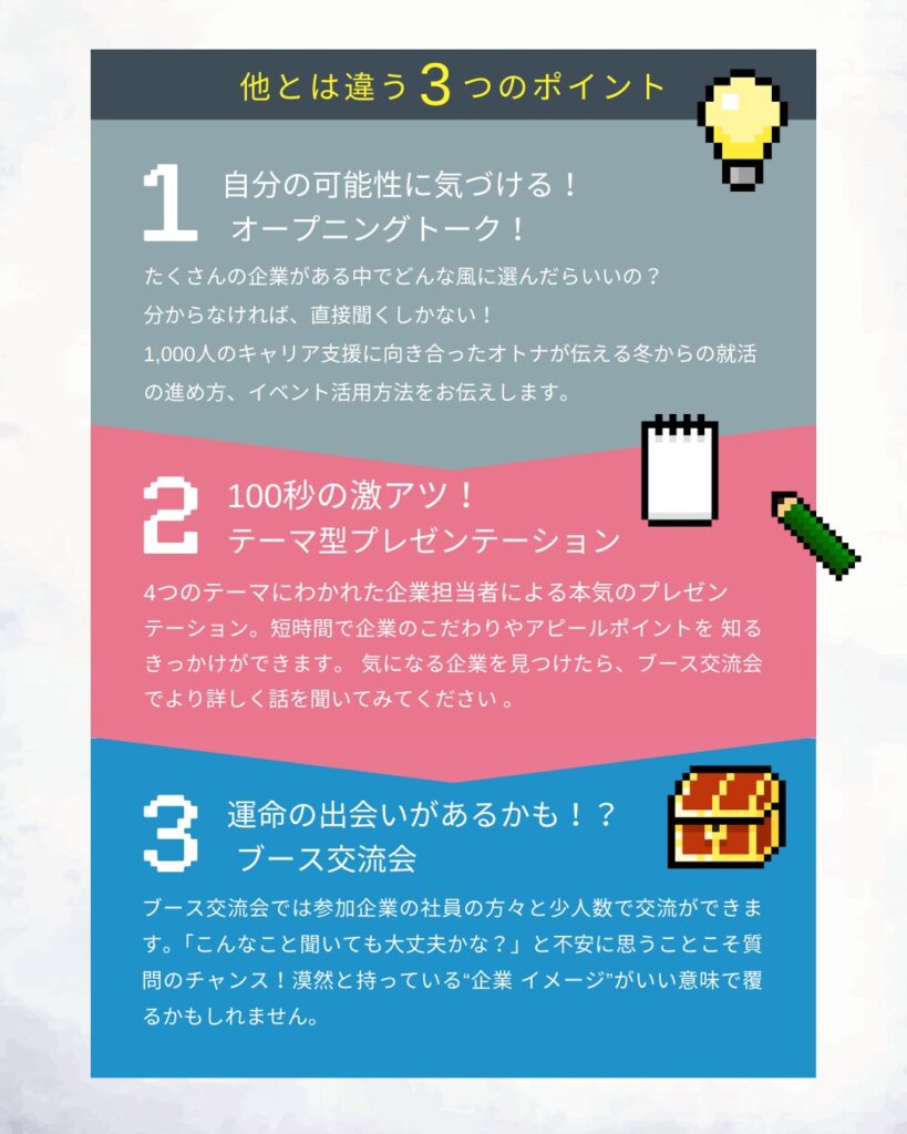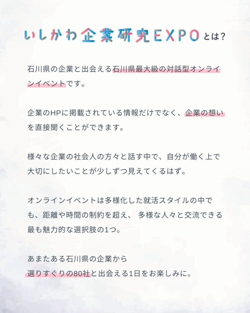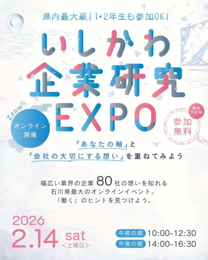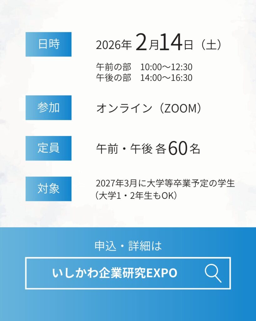2026年2月14日(土) 14:00~16:30「いしかわ企業研究EXPO」午後の部に参加します! 場所:オンライン(ZOOM)対象:2027年3月に大学等卒業予定の学生(大学1・2年生も参加OK) URL :詳細はこちら Post Share Hatena LINE 【2/20・3/26 WEB】IKUEIのウェブセミナー 前の記事 【2/10 WEB】面談体験☝学習アドバイスをしてみよう 次の記事